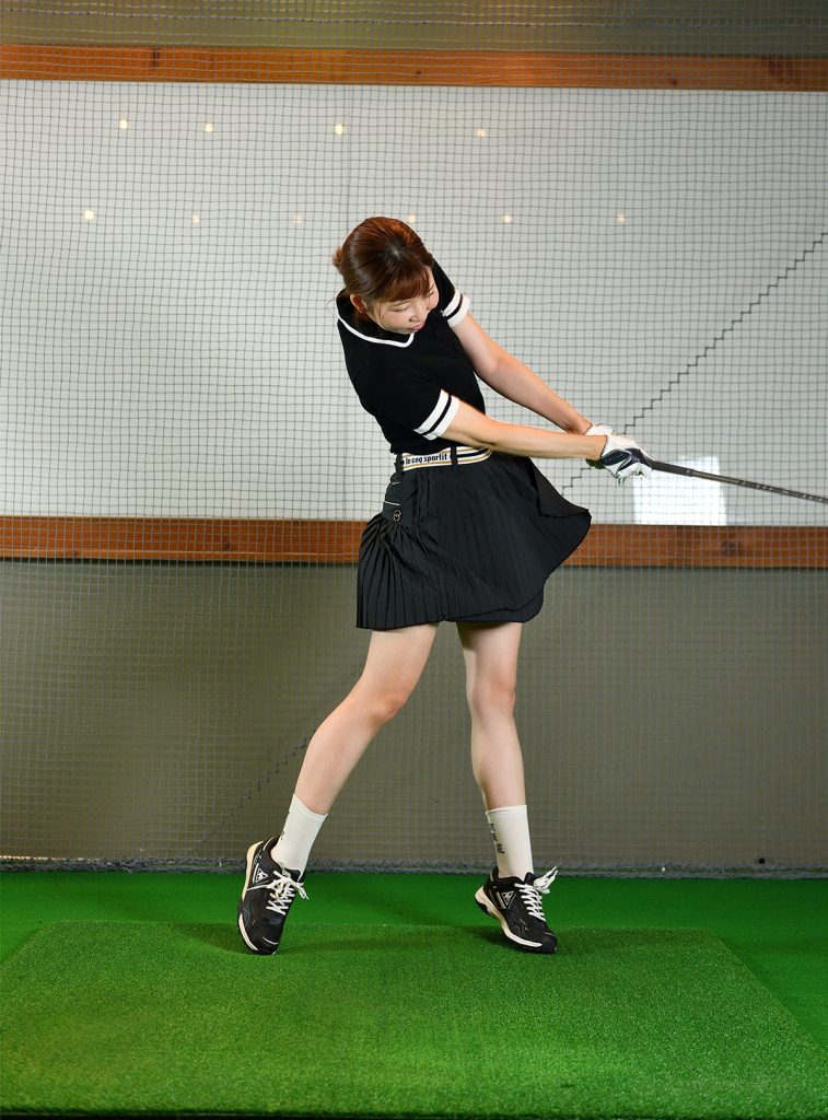 テークバックではできるだけ体幹の大きな筋肉を使い、クラブが自然に上がるところまで上げればいいという意識を持つといい。それ以上高く上げようとすると、軸が左に傾く、右わきが大きく空くなどの不必要な動作が生じやすくなる