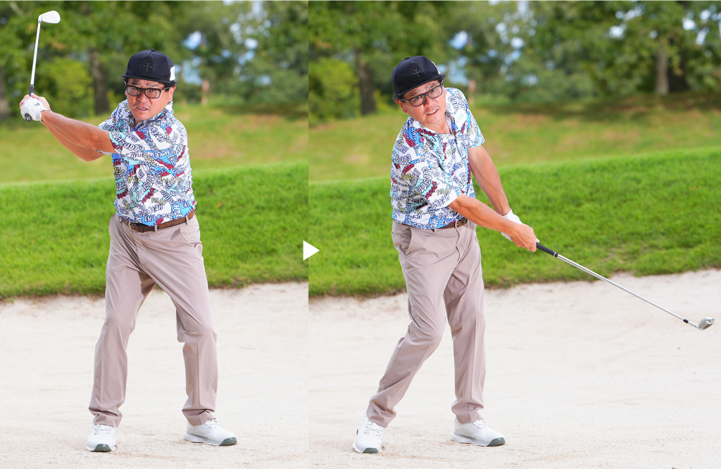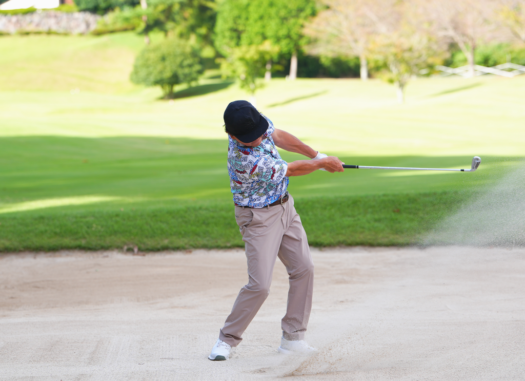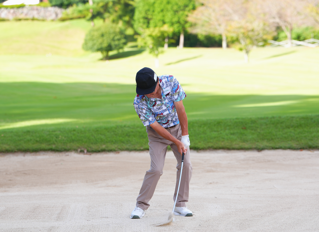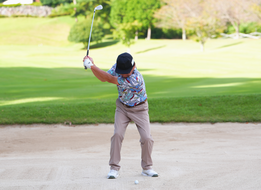 「8Iを持って、いつもSWでやっているエクスプロージョンとまったく同じイメージでショットします。8Iでも、ソールがちゃんと砂を爆発させてくれるので、SWよりもプラス15ヤードくらい飛んでくれる弾道を簡単に打てるんです」