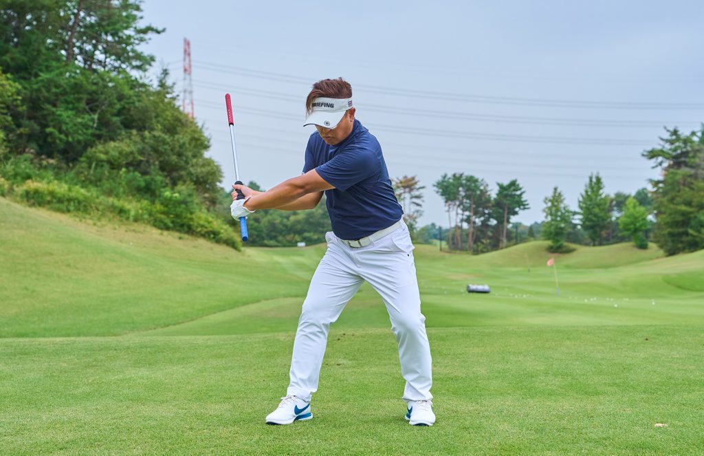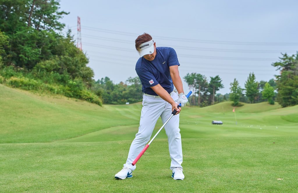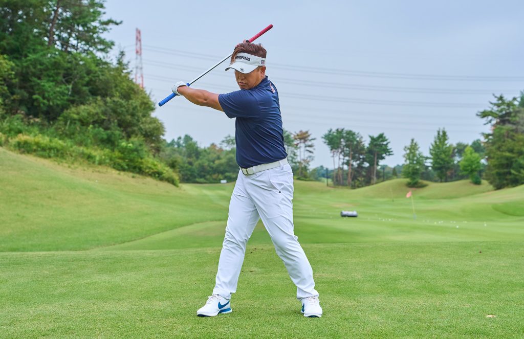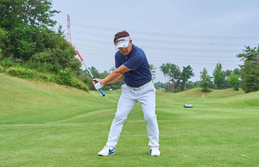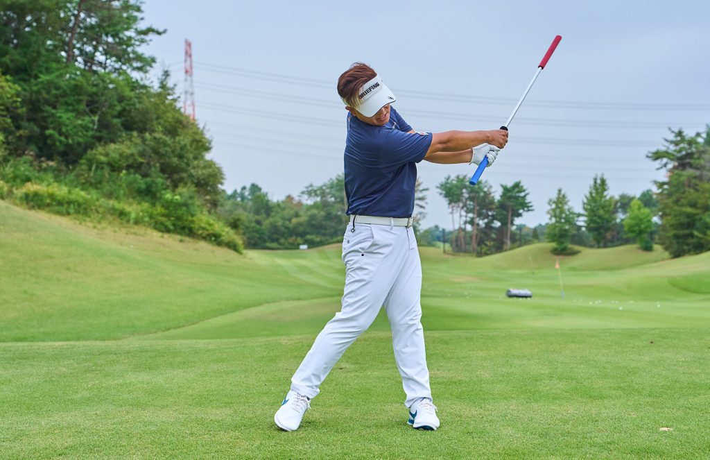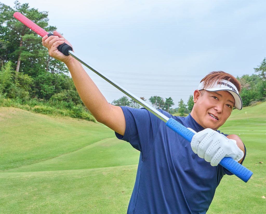 「左手で青グリップ、右手で黒のスライドグリップを握ります。右手をスライドさせてトップまで上げたら、左足の踏み込みで切り返します。このとき、スライドを戻しながら下ろせば、自然にインから手を下ろす軌道になり、頭が左に突っ込む動きを防げます」