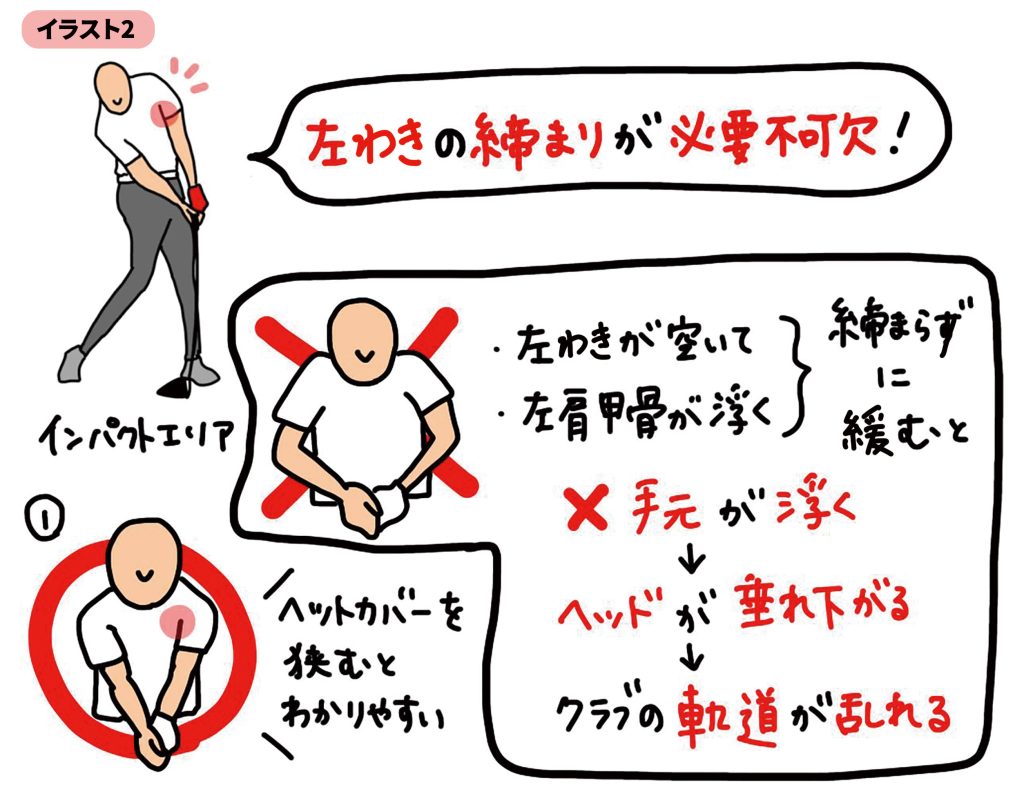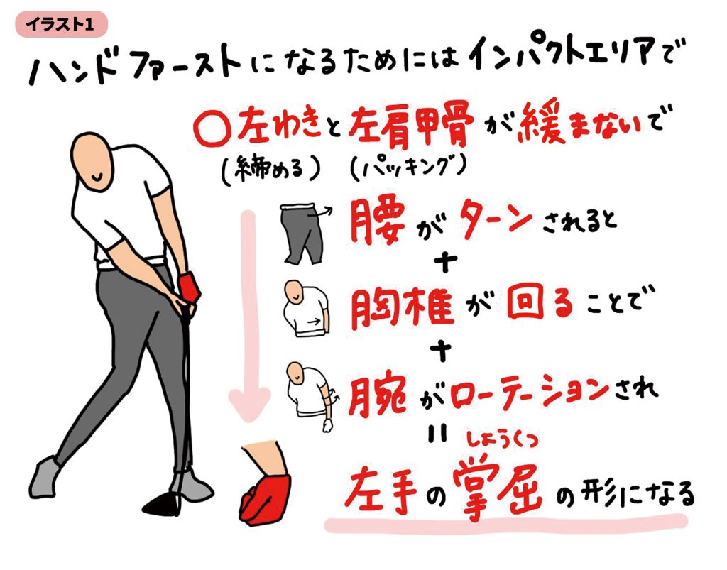 しかし、多くの方はインパクトの際、左わきの締まりや左肩甲骨が緩くなっているようです。左わきと左の肩甲骨が緩んでしまうと、左わきが空いて左肩甲骨も上に浮いて、手元のグリップ位置が浮いてしまうため、ヘッドが垂れ下がり、クラブの軌道が乱れてしまいます。こうなると、さまざまなミスショットが出てしまうので、注意が必要です。再現性の高いインパクトには「わきの締まり」が不可欠なのです! 正しいハンドファーストインパクトを迎えるに当たって、覚えておきたい順序をイラスト1にまとめてみました!
