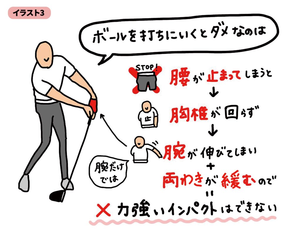 次に、ダウンスウィングでヒップターンをしっかり行っていきます。ボールを打ちにいって腰のターンが止まると、インパクトで腕が伸びて両わきが緩んでしまうので、力強いインパクトができなくなります(イラスト3)。このことからも、ボールを打ちにいかず、しっかり腰がターンされていくことがいかに大切かがわかります。