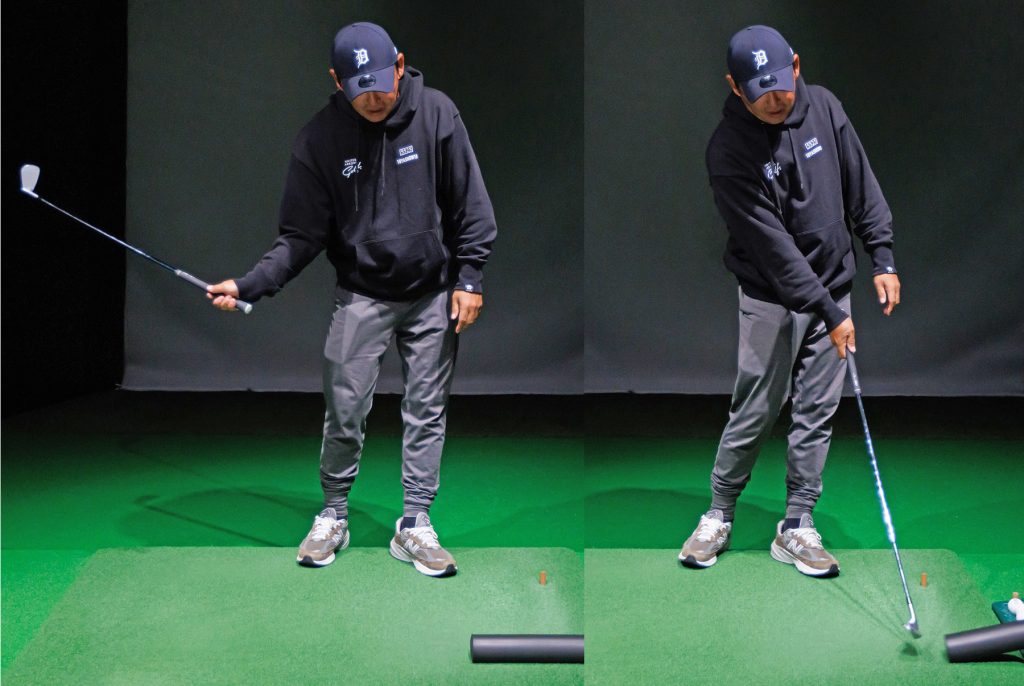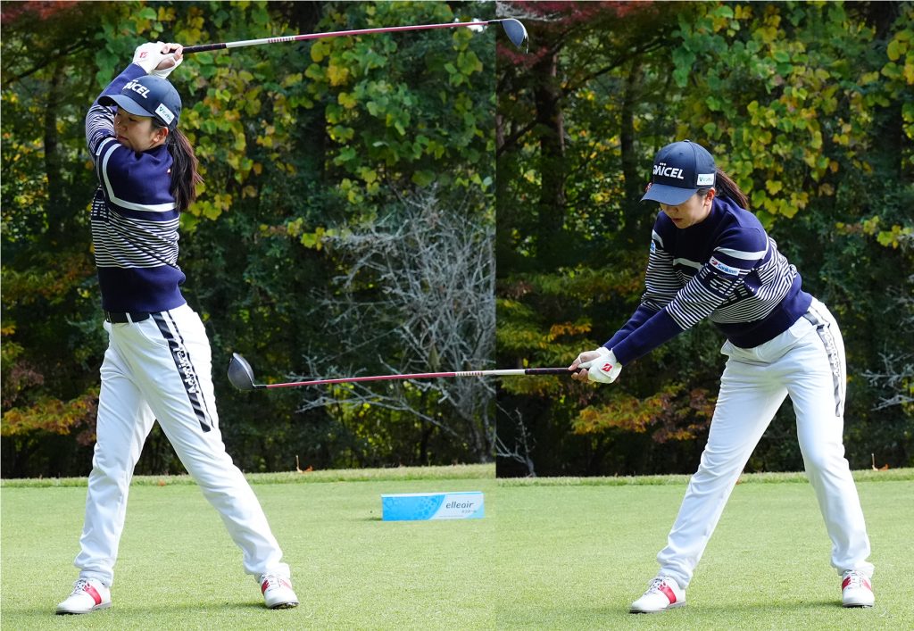 森 そうです。右手1本でクラブを持って、地面に置いてあるモノを真っすぐ飛ばそうと振り上げてみるとよくわかります。叩けるポジションって1カ所、だいたい右腰あたりになります。1000人振ったら1000人がだいたい右腰あたりから叩くはずです。なぜなら、そこからしか真っすぐ叩けないし叩きにくいからです。こっちゃん(堀琴音)がルーティンで体の右側でお辞儀をするような動きをするのはトップでリバースピボットになる癖があるから。ダウンスウィングであのお辞儀する動きを体に染み込ませることで、彼女が叩けるポジションに戻しやすくなるんです。フルショットは叩けるポジションまで戻すだけの余白と時間があるから、それまでの動きは彼女みたいな独特な感じでも何の問題もないんですよ。