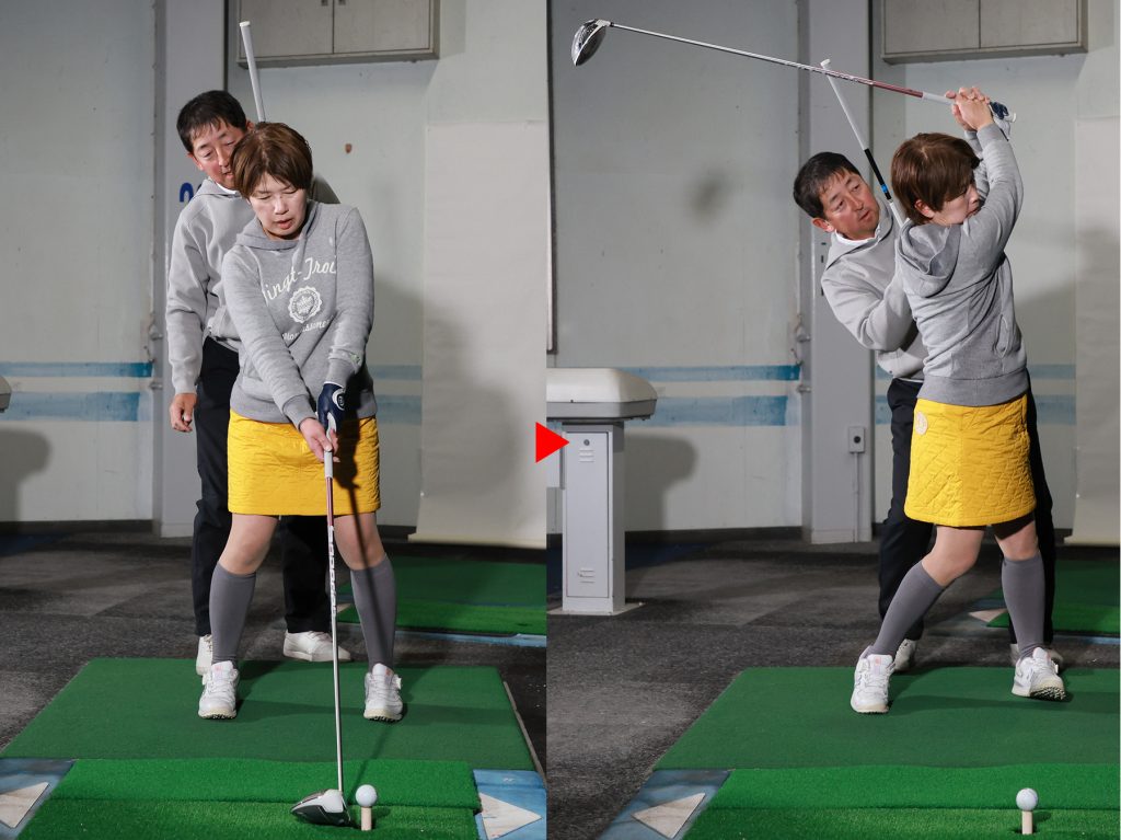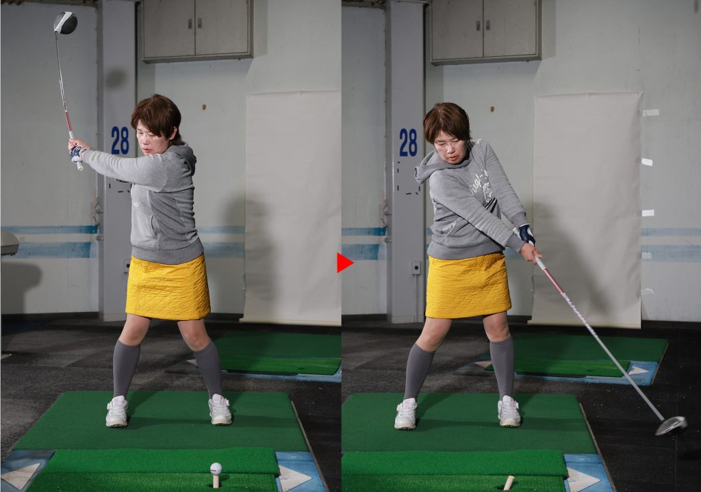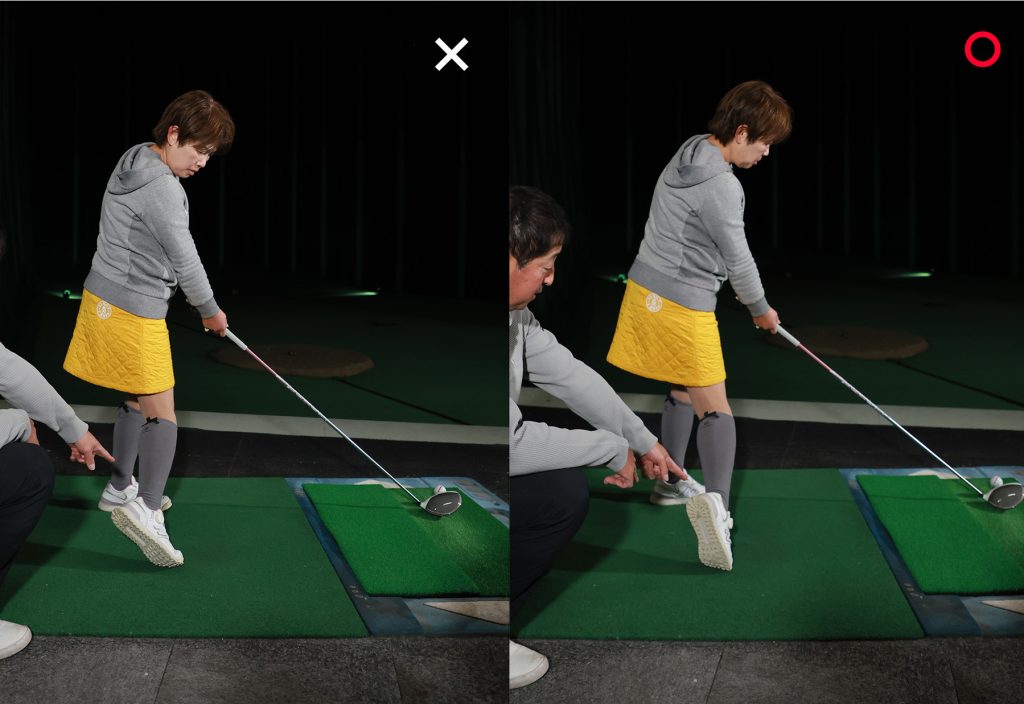 原 それと右足かかとを大きく動かして下ろすと、右肩も前に出ちゃうので、ベタ足でクラブを下ろす意識を持つといいですね。