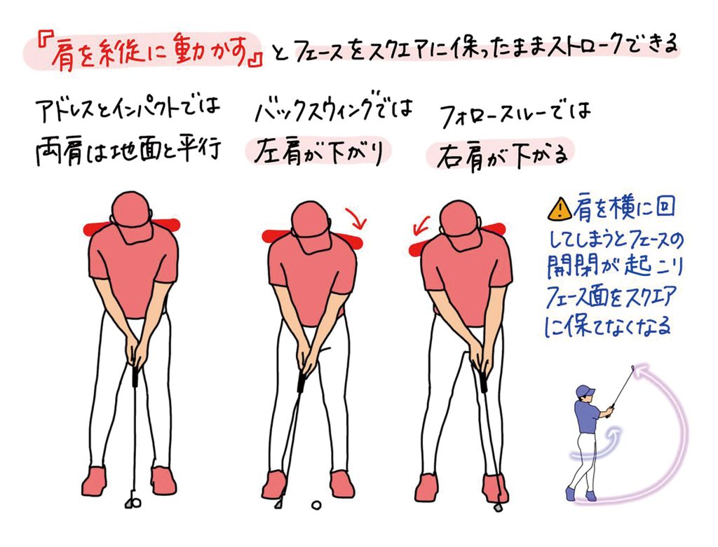 また、パッティングはインパクトでフェース面をスクエアに保ち、ラインに対してヘッドを真っすぐ引いて真っすぐ出すために、『肩を縦に動かす』ことが大切です。