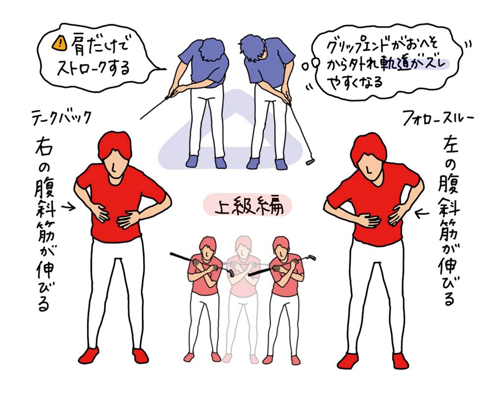 このイメージを持ちながら、肩を縦に動かすことができれば、テークバックでは、右わきの腹斜筋が伸びて、フォロースルーでは左の腹斜筋が伸びます。プロたちはこの腹斜筋の伸縮による体のひねりを使い、肩を縦に動かしてストロークしています。