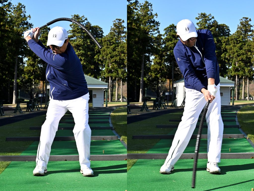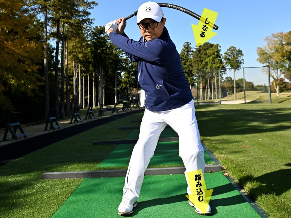 「フレックスロッドがトップでしなる瞬間と左足を踏み込むタイミングを合わせます。これで、ロッドがしなる方向と体が切り返す方向が逆になって、ロッドの先端が遅れて下りてくるため、ゴルファーなら誰もが“タメ”を体感できます」(吉田)