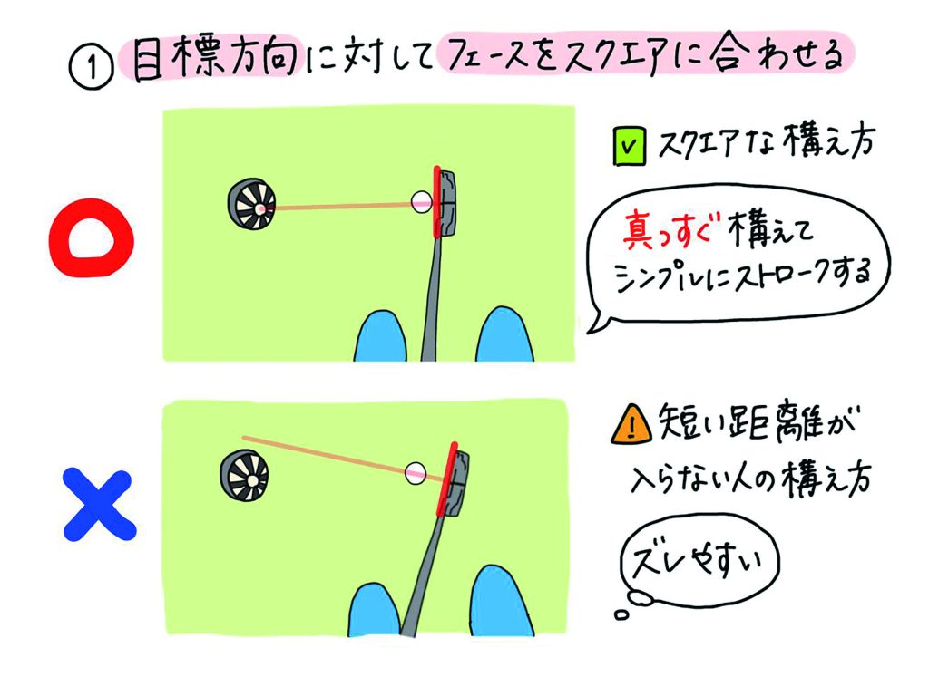そんな基本の「構え」では、打つ前のフェースを目標方向にスクエアに合わせることがとても大切です。しかし、1メートルが入らないゴルファーの多くは、打つ前の構えでフェースの向きが目標方向に定まっていない傾向があります。短い距離を外してしまう方は、ぜひ打つ前のフェースの向きを丁寧にチェックしてください。