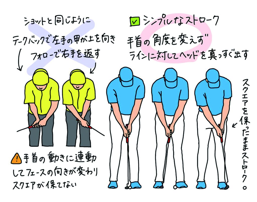 手首の角度を変えず、ロックさせたほうがインパクトでフェースの向きがブレにくくなります。シンプルで正確なストロークはラインに対してヘッドを真っすぐ引いて真っすぐ出す動きです。