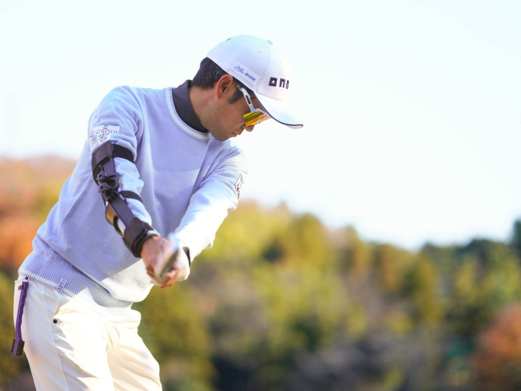 右ひじと手首の両方を使ってダウンスウィングで強烈なタメを作っていた浅地だが、ヘッドの入り方の再現性が低かったため、ビックリするようなミスが出ることがあった。それを改善するために、まず初めに取り組んだのが右ひじを曲げない作業だった
