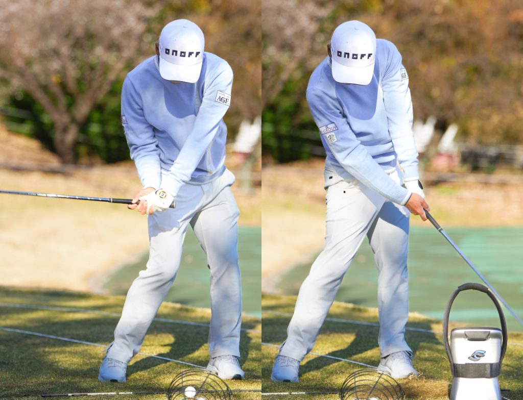 植村 そうですね、洋佑はアプローチもショットと同じようにひじやひざを大きく使っていました。特にアプローチではひざを柔らかく使い、いろんな球種をSW1本で打ち分けていました。もちろん悪いことではないですが精度は落ちます。それではグリーンを外したらすぐボギーになってしまい、プロの舞台では絶対に戦えません。常に上位争いができるようにするために、まず取り組んだのが下半身の動きをおとなしくさせることでした。