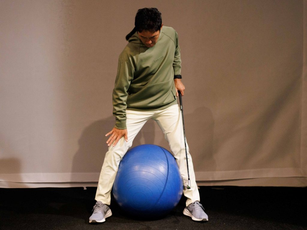 表面ではなく内側のパワーを使うために必要なのが股関節を動かせるようになること。大きなボールを足の間に挟みスウィング。ただ、ボールを内ももでつぶすように内側に絞るのではなく、紙風船だと思ってつぶさないように振る