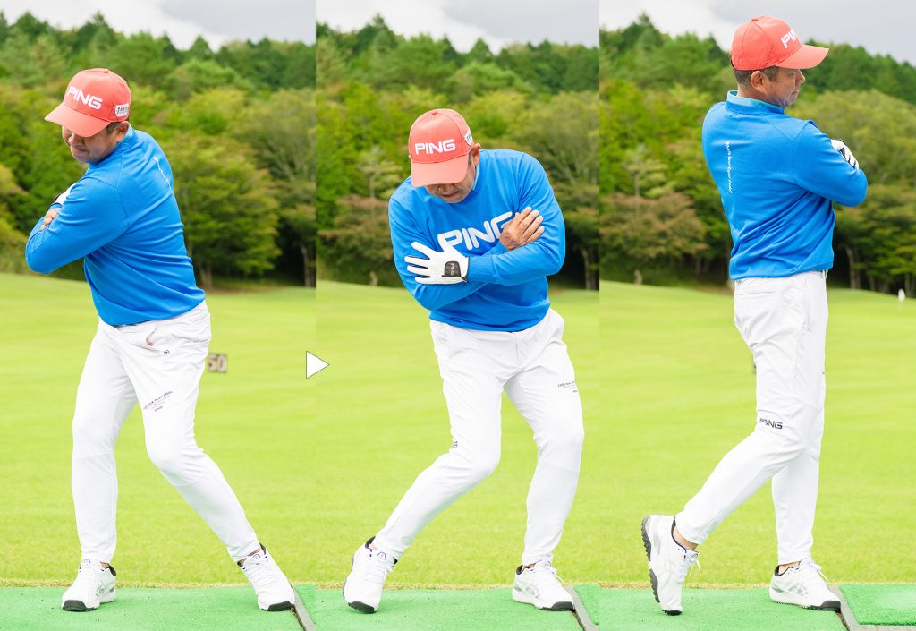 「デッドハンドドリルの定番といえば、ボディドリルです。胸の前で両手をクロスしたり、肩にクラブを担いでもいいです。手を使えない状態で、体を回す感覚をしっかり体に覚え込ませましょう」