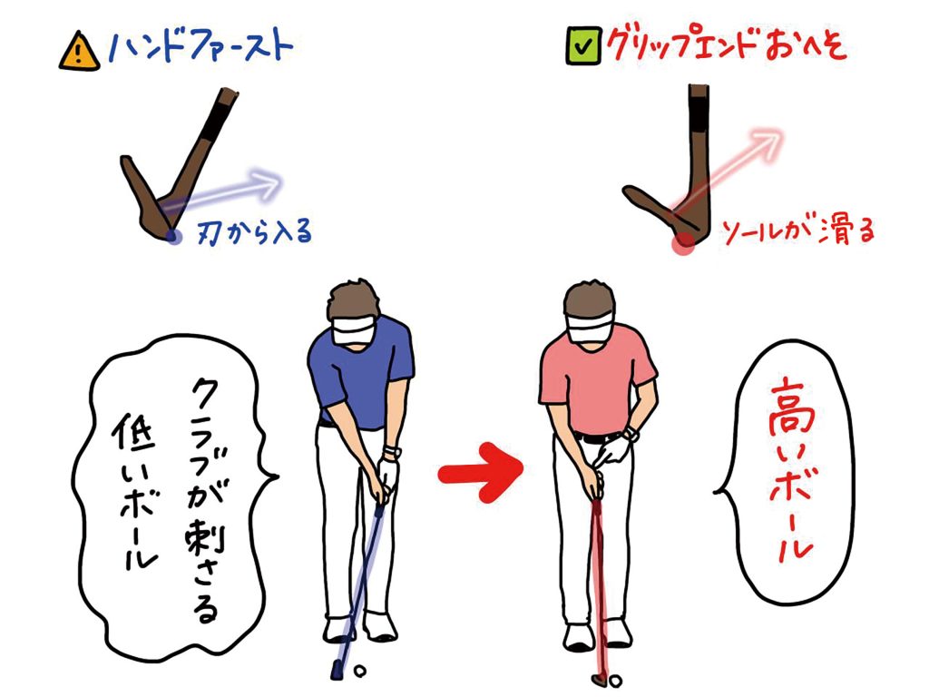 こうするだけで、リーディングエッジから突き刺さっていたクラブを、ソールを使って滑らせていくことができるようになります。