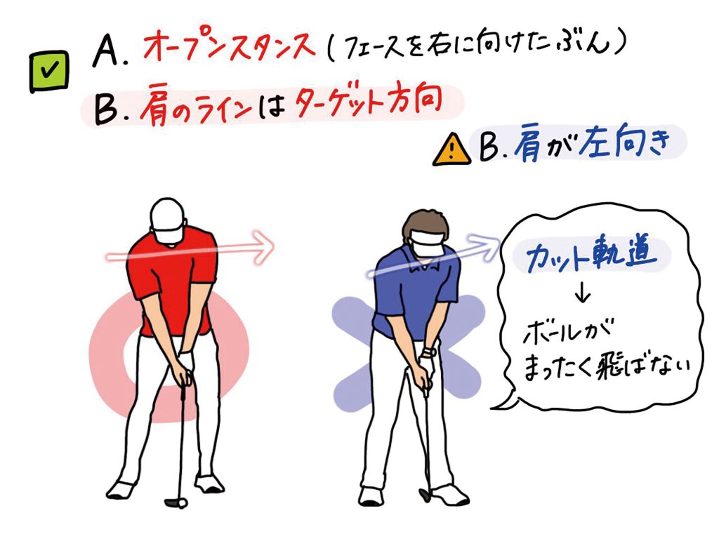 グリップエンドがおへそを向き、フェースを開いた状態ができたら、次は足の位置と肩の向きです。フェースが開いて、右を向いたぶん、足の位置をオープンにすることで、振り抜く向きを左方向に調整します。このとき、肩のラインはほぼターゲット方向であることが大切です。