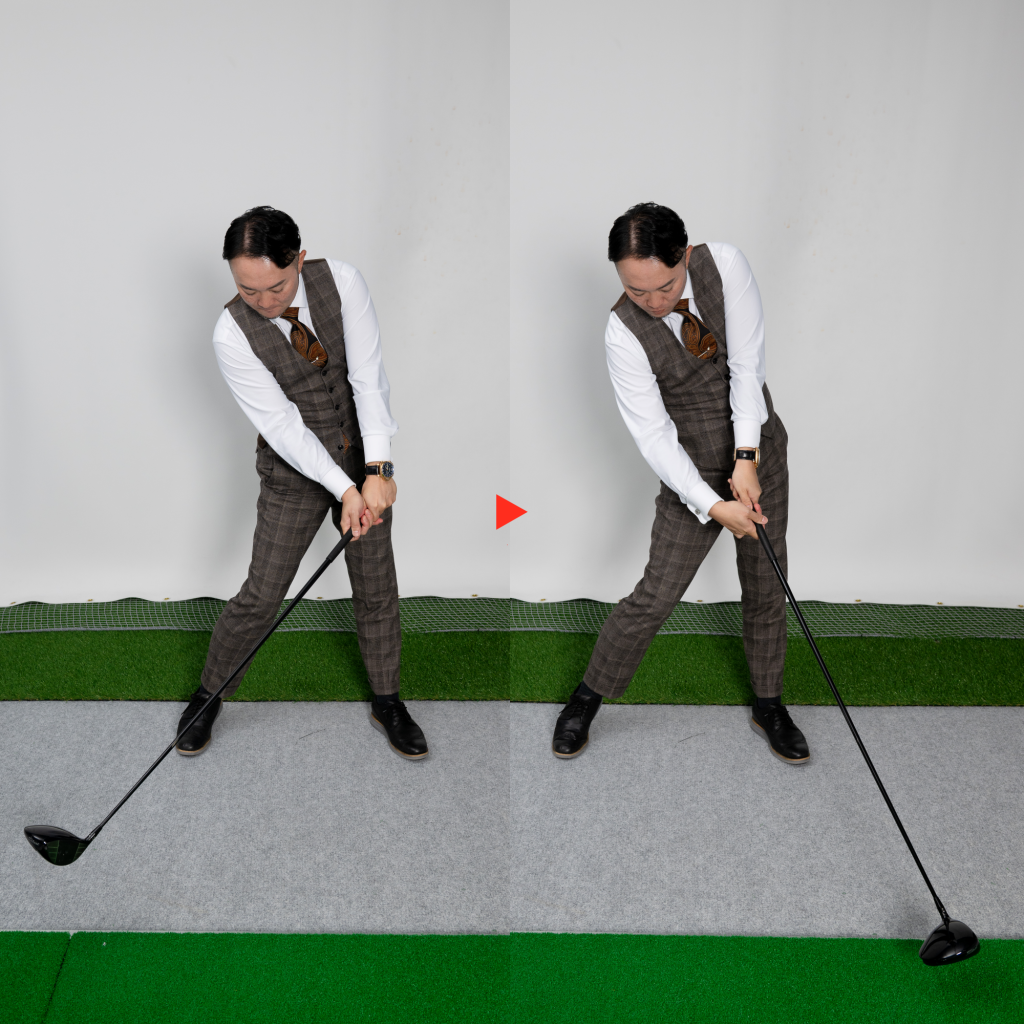 そういう人は、だいたいシャフトをしならせられていないんです。飛距離を出すためには自分だけ頑張ってもダメで、シャフトにしっかり負荷をかけてそのしなり戻りをバチンとインパクトに合わせることが必要なんです。これができなければ、どうやったってインパクトの効率は上がりません。