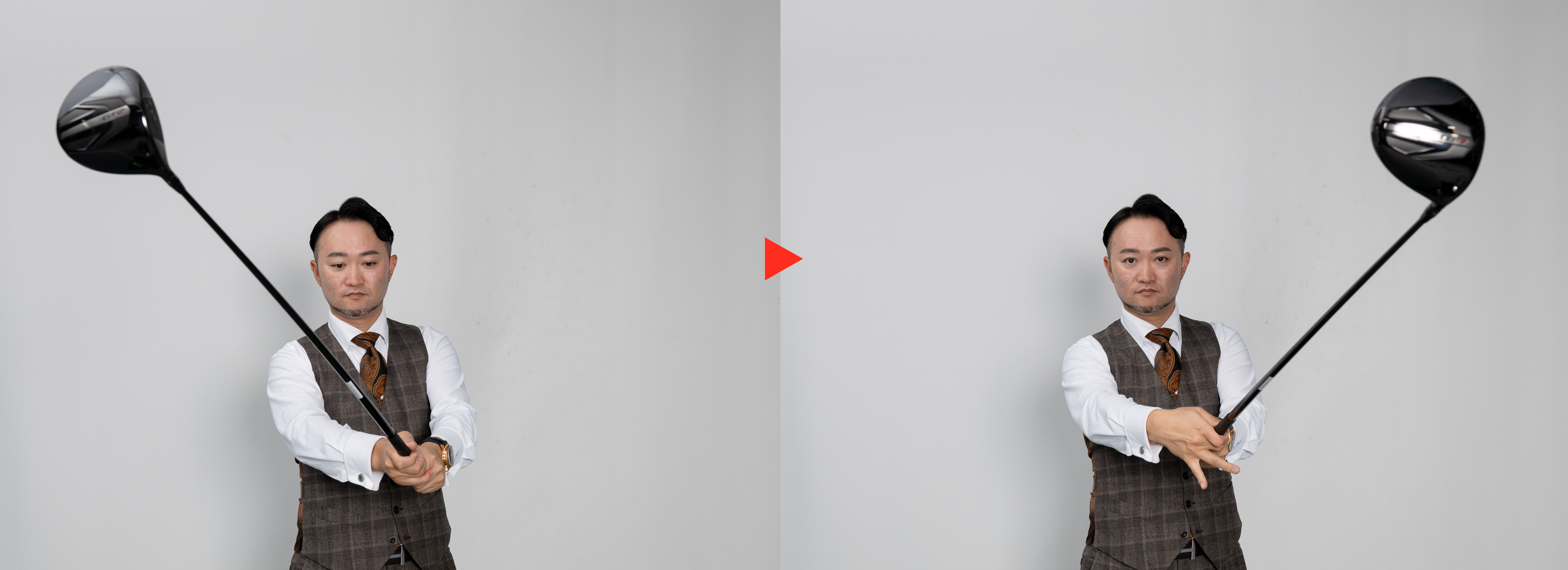 インパクトでビジェイみたいに右手を思い切り手のひら側に使えれば、絶対に球は飛びます。「そんなに右手を使ったら左に行きそう」と思いますか? そんなこと考えているから飛ばないんです。ゴルフスウィングのインパクトなんて一瞬ですから、この動きのせいで引っかけるなんてことはありませんし、この手の使い方ならフェースはねじれません。左に行くとしたら、単純に軌道が悪いかフェースコントロールが下手かのどっちかで、右手を使いすぎているせいじゃありません。