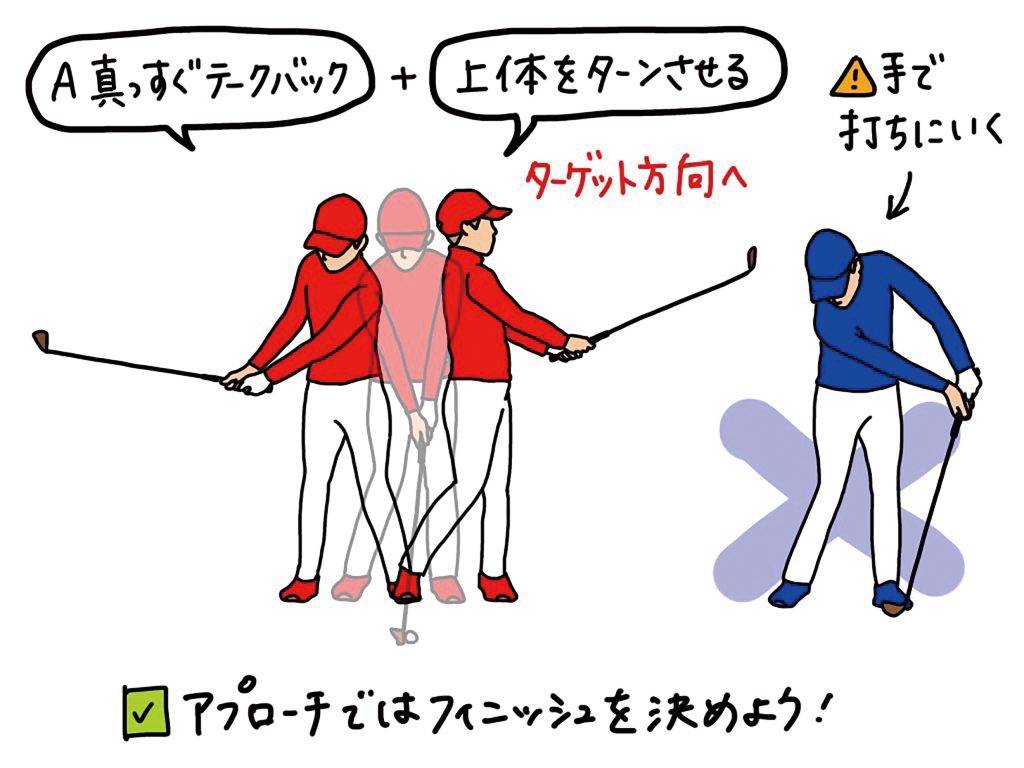 クラブを持ったら、両手の位置関係を保ったまま腰の高さまでクラブを振り上げましょう。下のイラストのBのようにインサイドに上げてしまう人は、右手を使い過ぎてクラブを持ち上げています。
