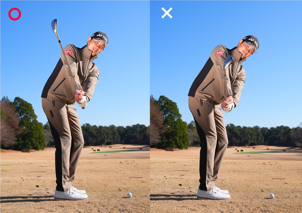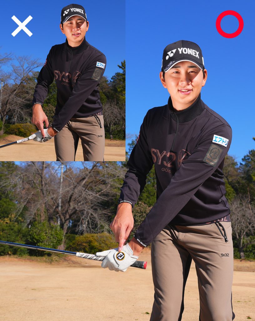 「左手甲の向きとフェース面はリンクしているので、左手の甲が正面に向くように上げると、フェースは自然と開いてくれます」