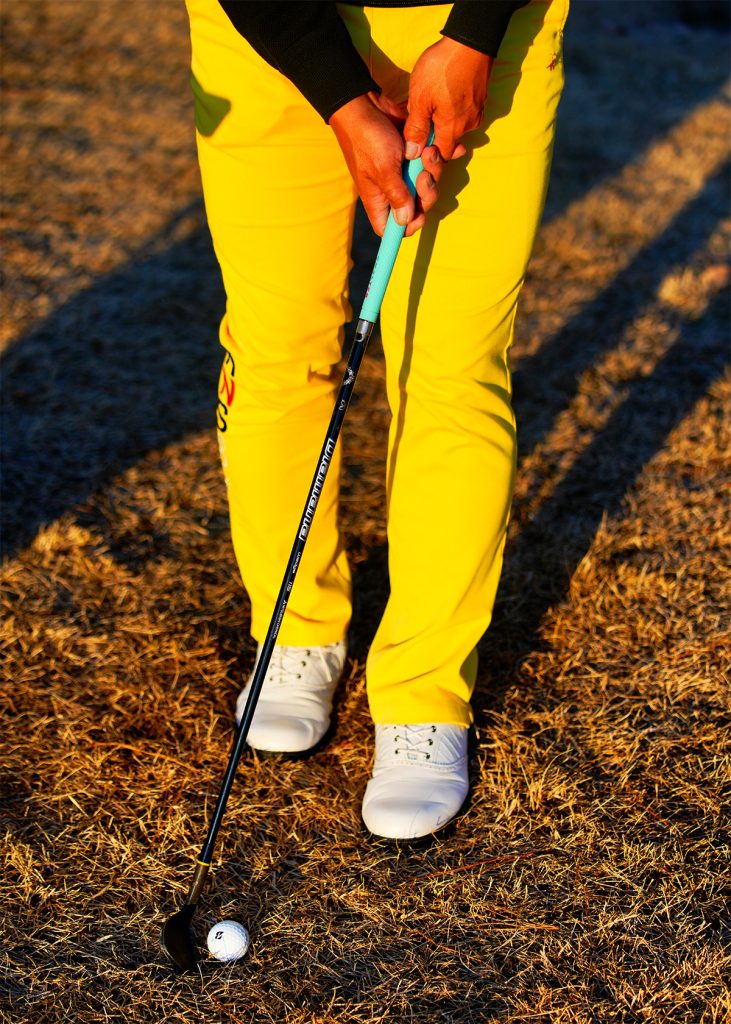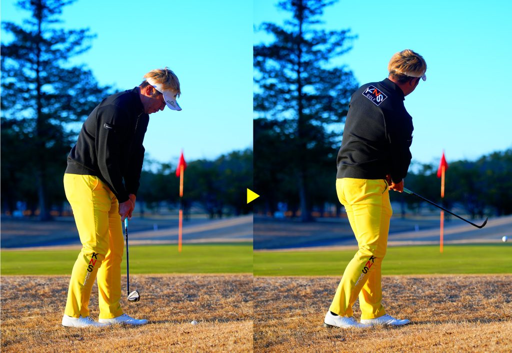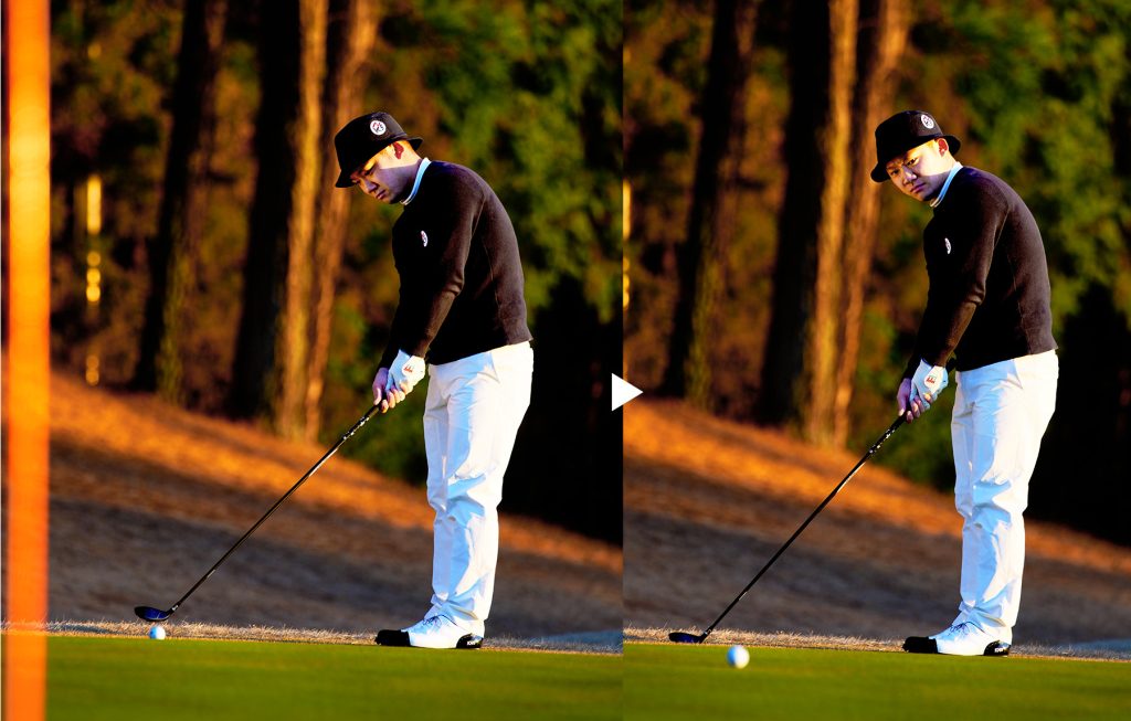 ショットというよりパッティングと同じ要領でアドレスするのがコツ。「スタンスは狭めに構え、ヒールをやや浮かせることで、突っかかることなく振れます」