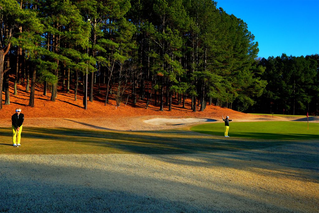 芝が薄く枯れたライはインパクトがシビアになるので、ソールを滑らせて使える3Wが寄せやすい。「球は上げず、手前からコロコロと転がすイメージです」