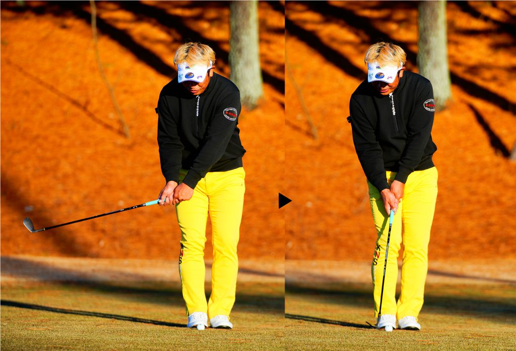 ヘッドはほとんど浮かさず、ソールを滑らせて横から払い打つ。「パットと同じストロークでいいんです」