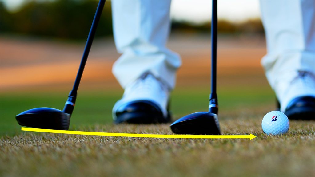 超インサイドアウト軌道にするために、アドレスでは右足を引いてヘッドの通り道を作る。フェースをかぶせることでドロー回転がかけやすい