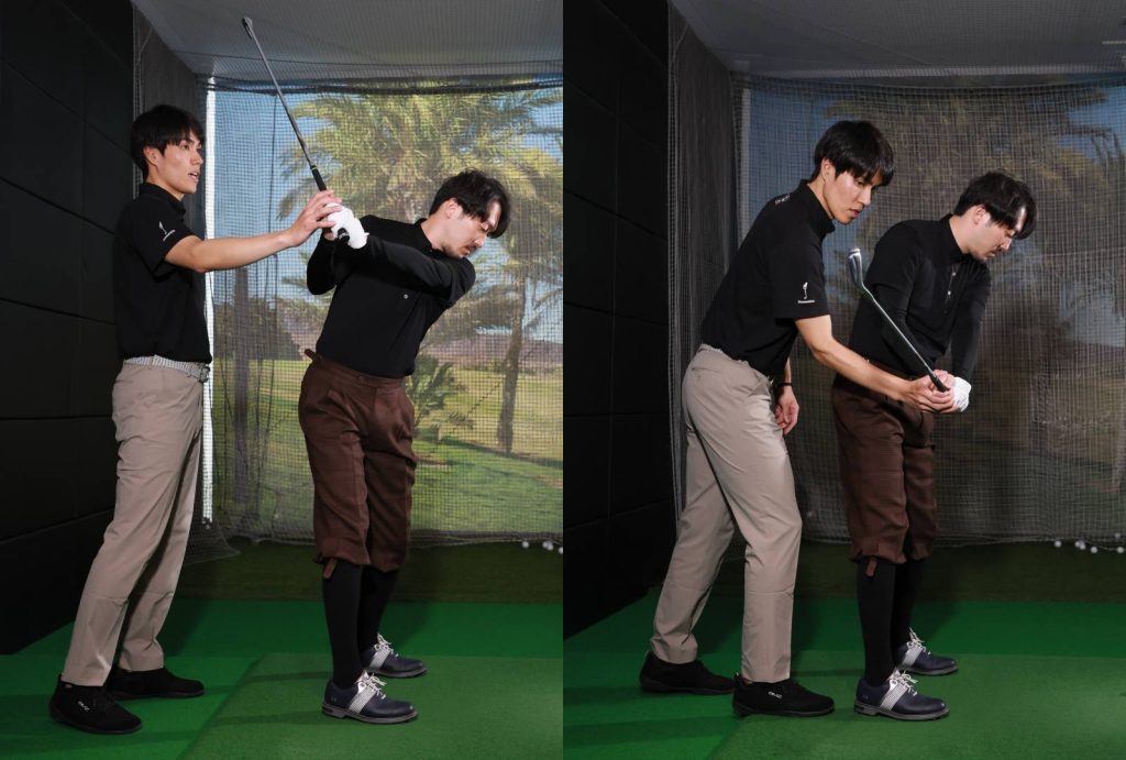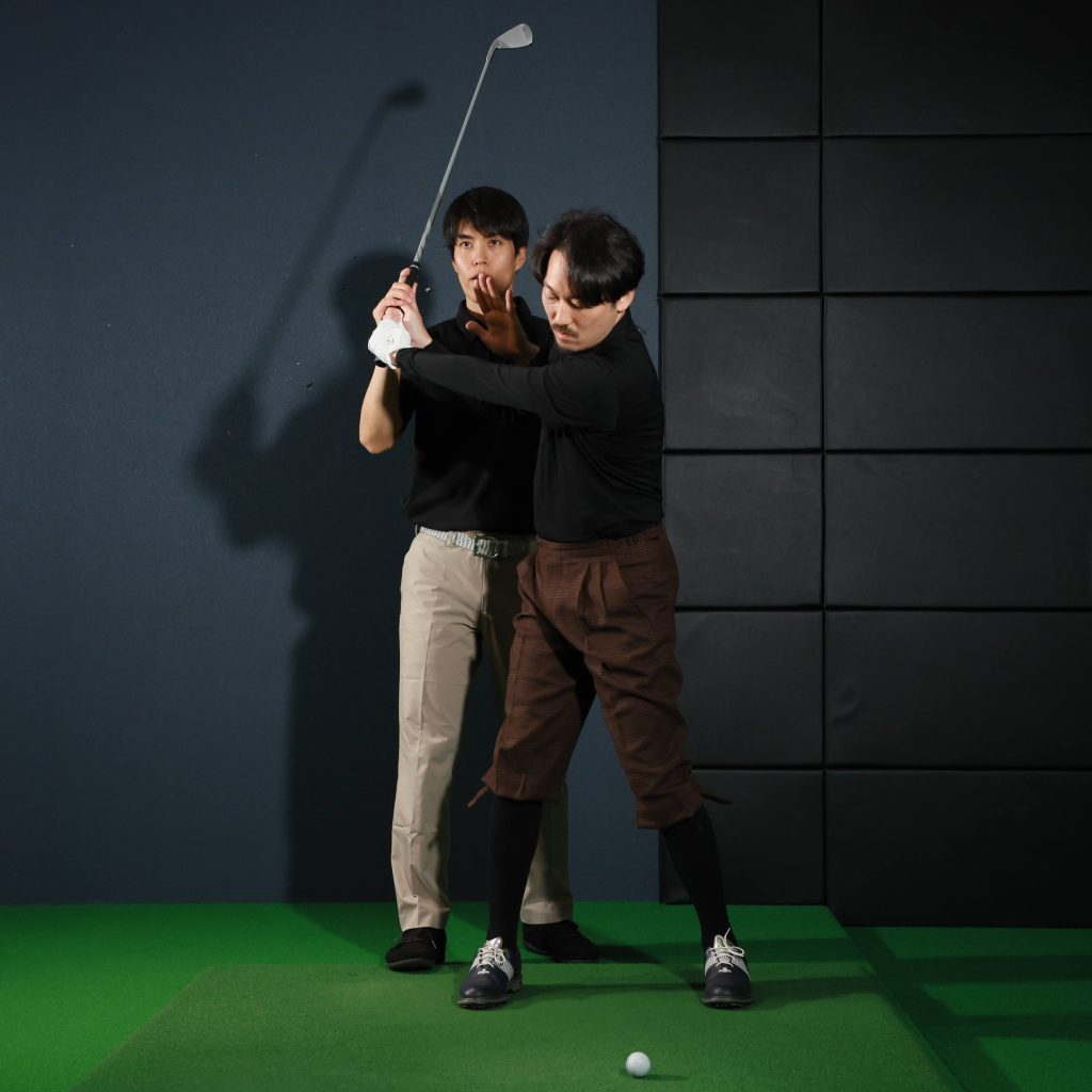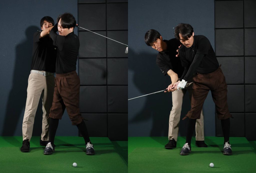 兼濱 実はそこが一番強く叩けるスタート地点で、大体の人がそのくらいの高さなんです。その高さを意識して、今度は両手で振ってみてもらえますか。