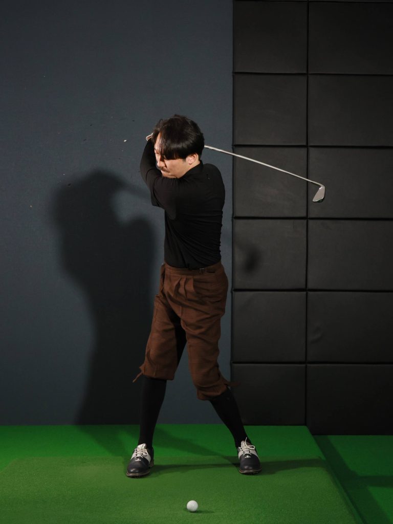 トップで手を肩の高さ、あるいは顔の横程度までしか上げないと、最小限の切り返し動作でクラブをプレーン上に引き戻せる。当然、インパクトの再現性も高まる。