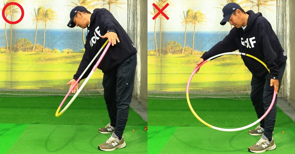 「振る」際に唯一気をつけたいのは軌道。ターゲットに真っすぐ振ることを心がけよう。フラフープなどの「面」の向きを意識することで真っすぐ振る感覚が養われる
