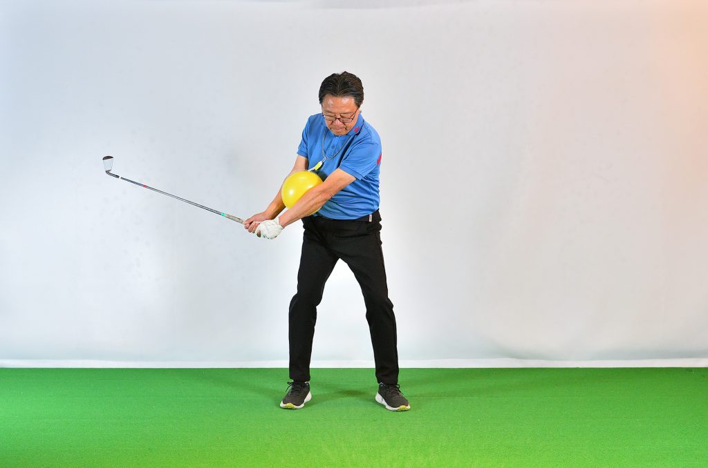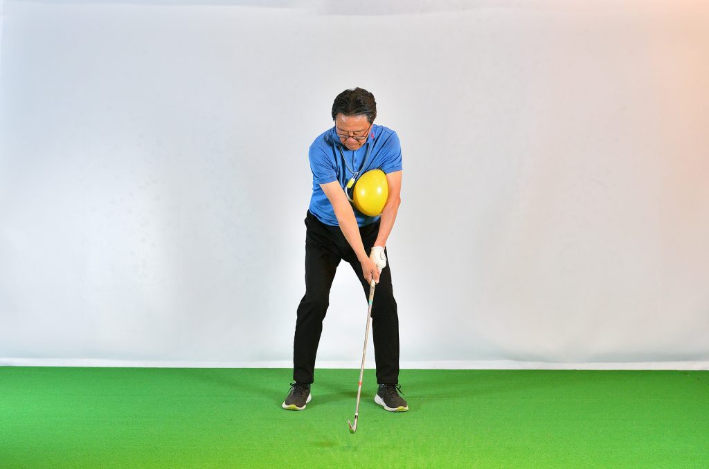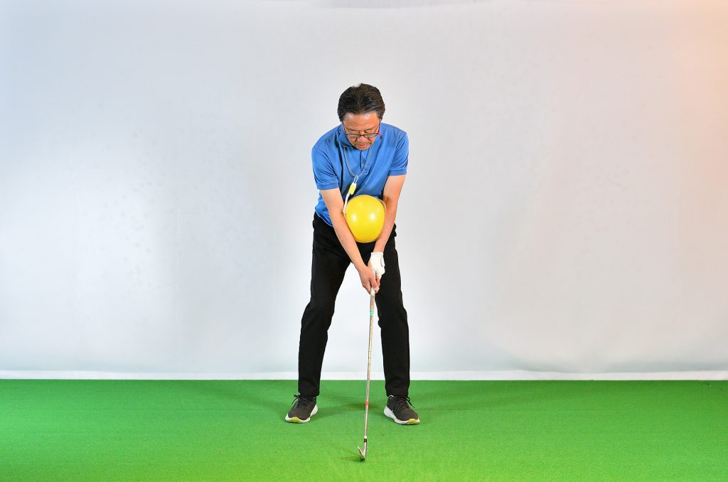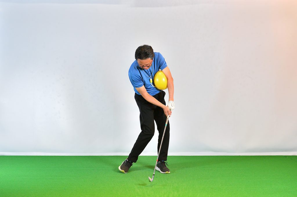 「100円ショップでも売っています。左胸、左のあばら骨あたりにボールを置き、左の腕で抑え、左サイドを動かすと向心力が見えてきます。このようなボールを使うとき、両腕に挟んでスウィングするドリルを思い出す方も多いと思いますが、そのドリルは、初心者などが手打ちを防ぐためのものとしては役立ちますが、グリップエンド支点になりやすい。より上達するためには、別の場所でボールを挟んで、向心力を体感してほしいのです」