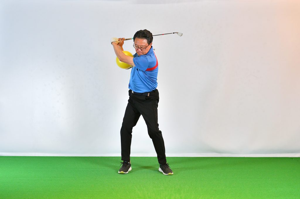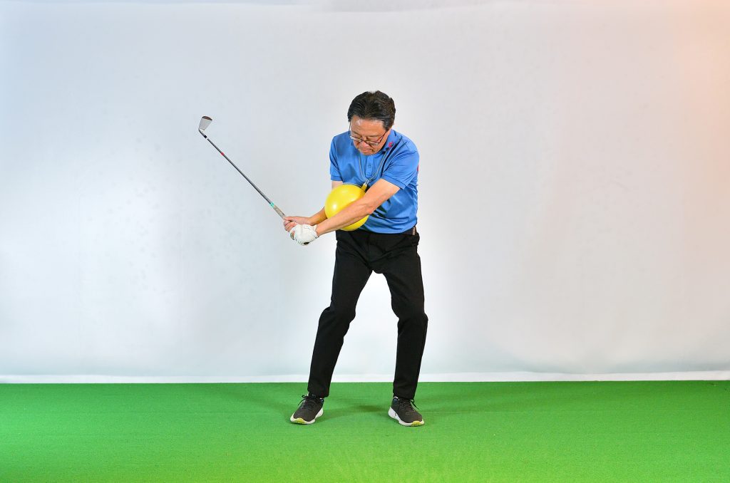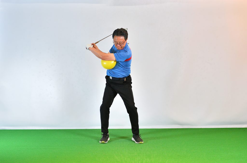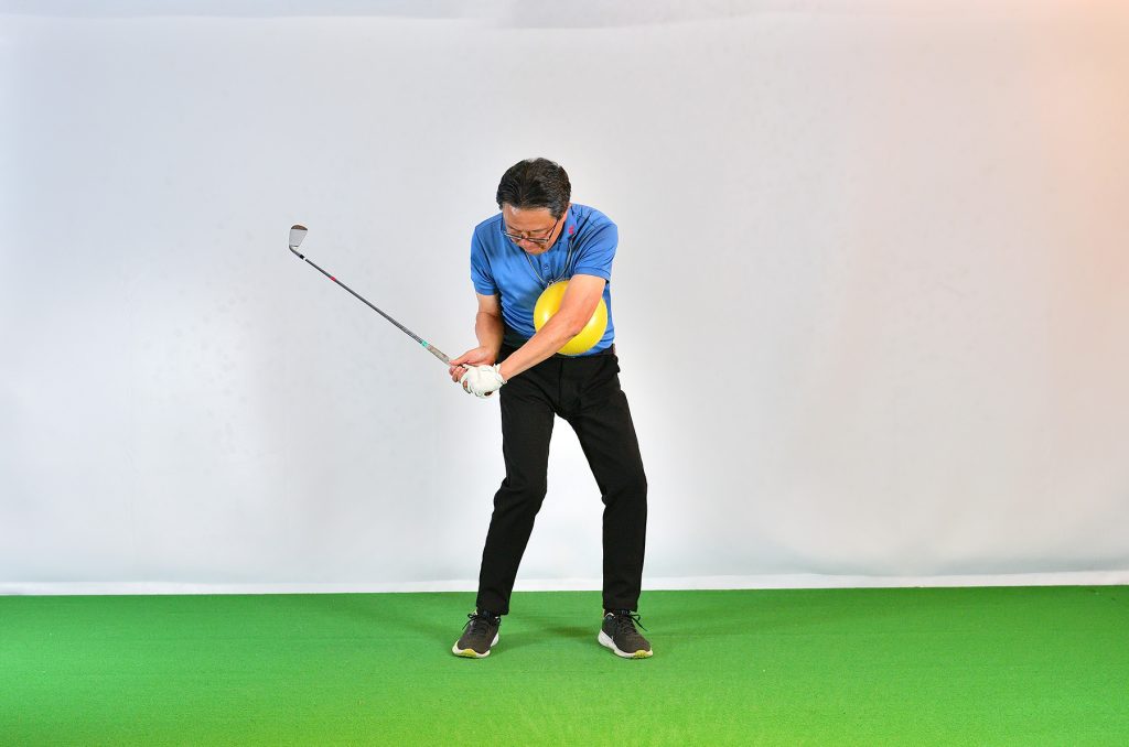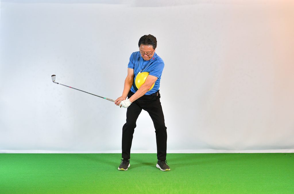 「100円ショップでも売っています。左胸、左のあばら骨あたりにボールを置き、左の腕で抑え、左サイドを動かすと向心力が見えてきます。このようなボールを使うとき、両腕に挟んでスウィングするドリルを思い出す方も多いと思いますが、そのドリルは、初心者などが手打ちを防ぐためのものとしては役立ちますが、グリップエンド支点になりやすい。より上達するためには、別の場所でボールを挟んで、向心力を体感してほしいのです」