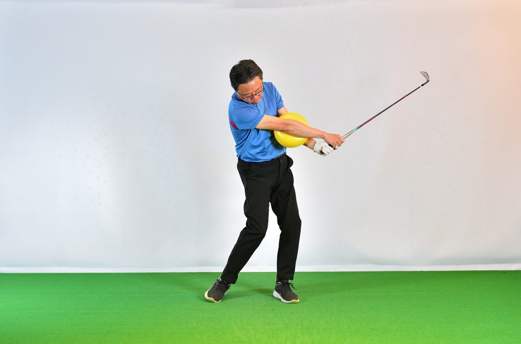 しかし、まずは両腕に挟んで、「遠心力メイン」のスウィングを体感してみよう。