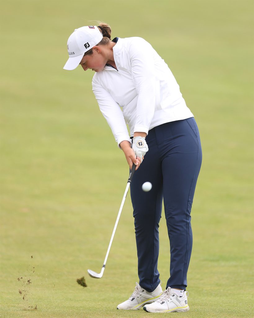 左サイドを動かすと手を使わなくて済むので正確性と飛距離が両立できる。「ダウンスウィングからの左サイドの動きが大きいから、右足が後ろにズレる動きも生まれます」