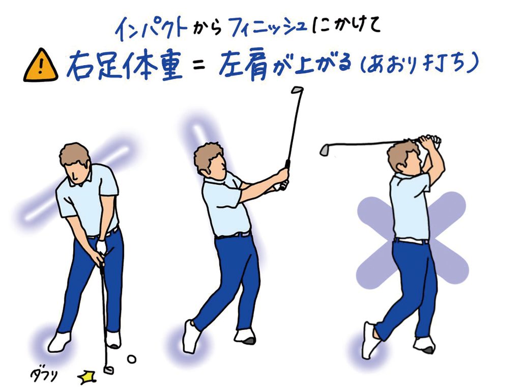 インパクトからフィニッシュにかけて右足体重のままだと、左肩が上がり、あおり打ちの形になってしまう。これがミスの原因となる