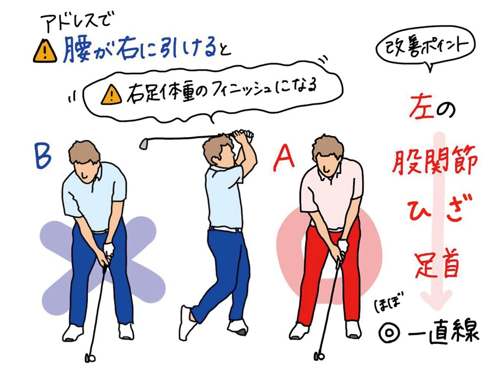アドレスの時点で腰が右に引けていると、右足体重のまま振ってしまう(B)。Aのように左の股関節、ひざ、足首がほぼ一直線になるように立ってみよう