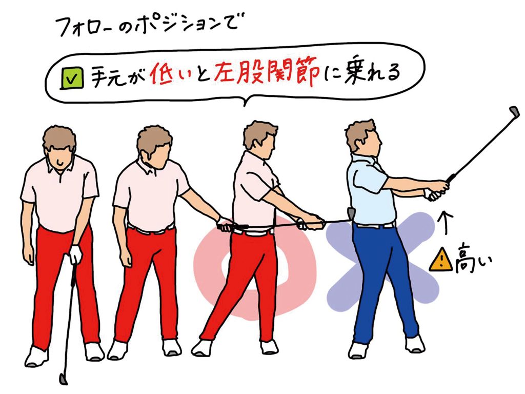 右足に体重が残っていた方は、フォローで手元が高いポジションに収まっているので、体が回転できなくなるので注意しましょう。フォローで手元が低いポジションを通過すると、左股関節に体重が乗ったまま回転することができますよ! ぜひ参考にしてください。