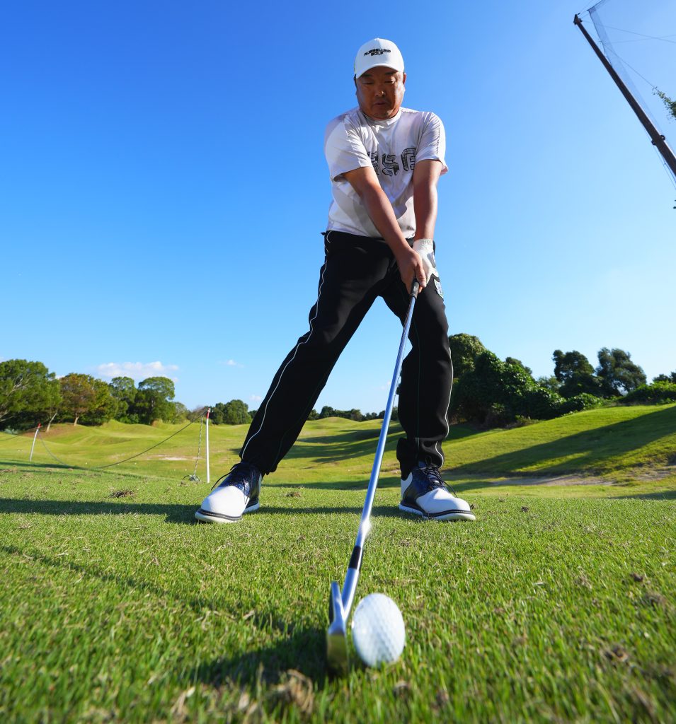 インパクト以降、右手首の角度を変えずにボールを押し込む。イメージ的にはインパクトから10センチくらいヘッドを地面と水平に押し込んでいく