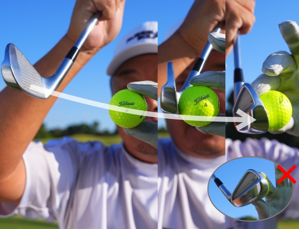 小田 地面にあるボールを打つので基本的にはヘッドは上から入ります。イメージはスコアラインの下2本目くらいをボールの赤道より少し下に入れる感じです。あとは、グッとボールを押し込むんですがイメージ的には、ロフトを立てながらヘッドを平行移動させる感じです。