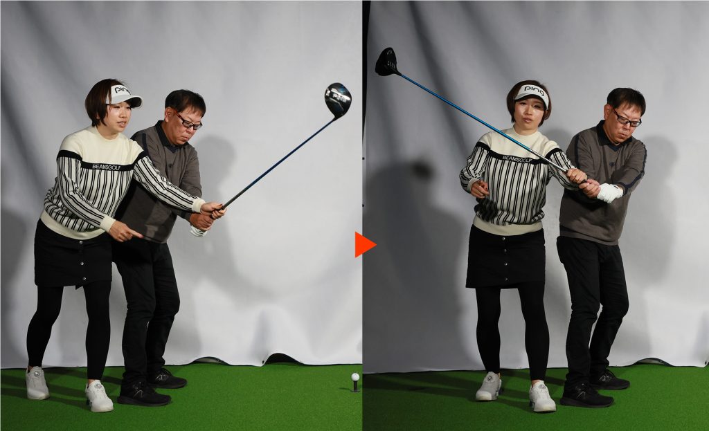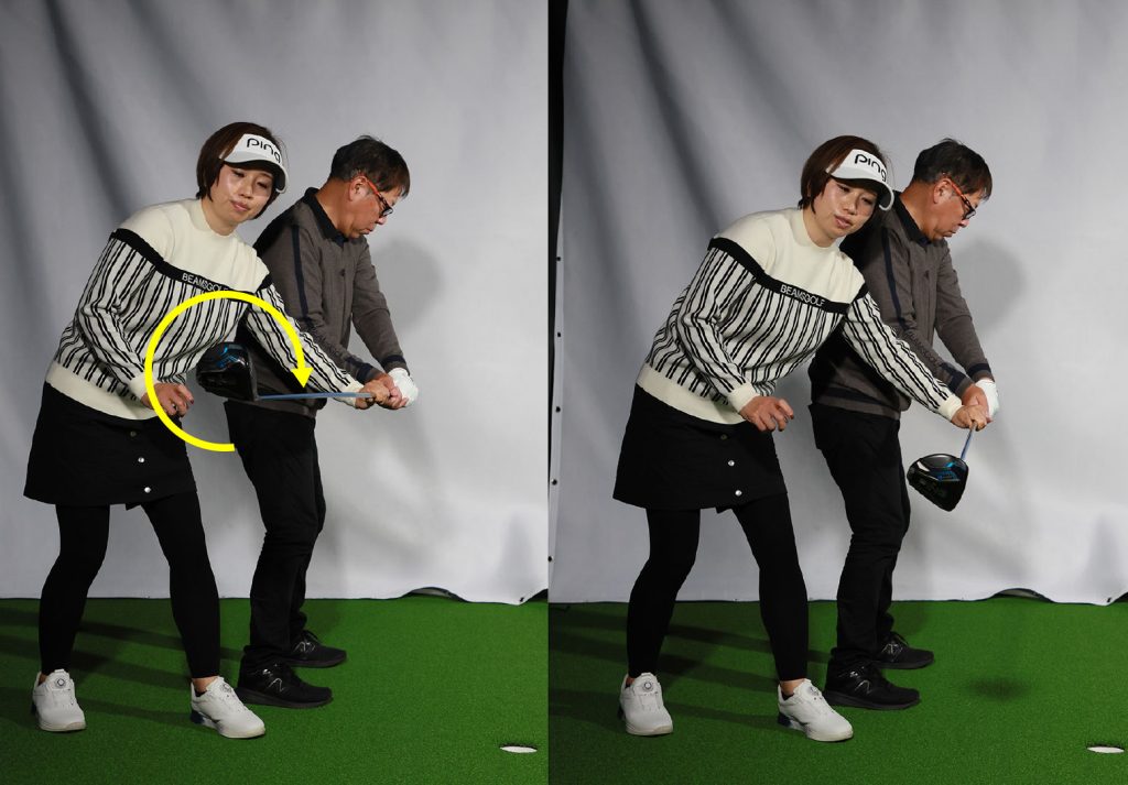 始動でヘッドがインに入ると、切り返し時に反動でクラブが外から下りる(逆ループ)。そうするとフェースが開きやすく、上体が伸び上がりやすい