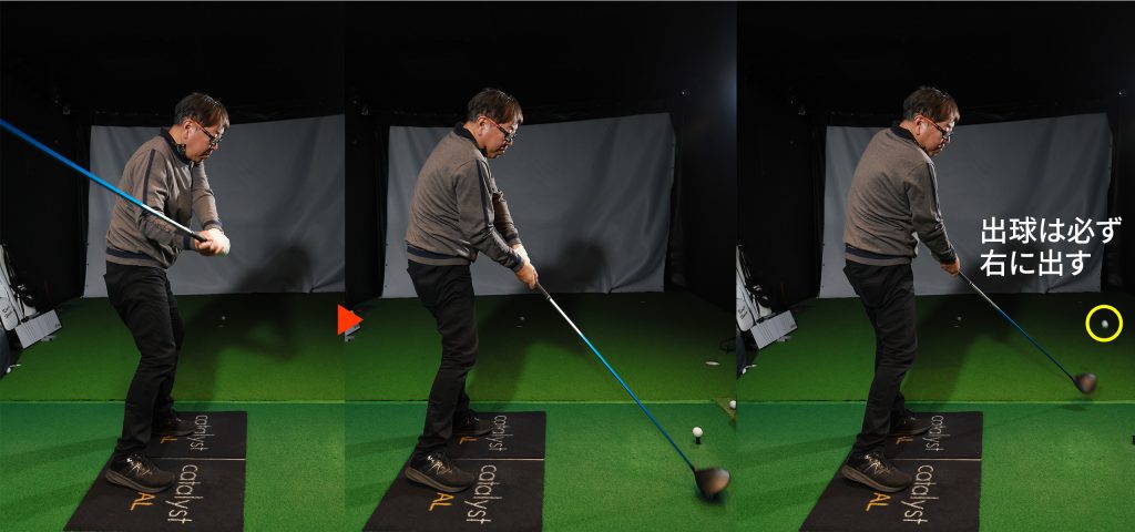 ダウンスウィングの途中で、シャフトを自分から見て反時計回りに回すとフェースが閉じる。この動きを入れるとつかまりが格段によくなる