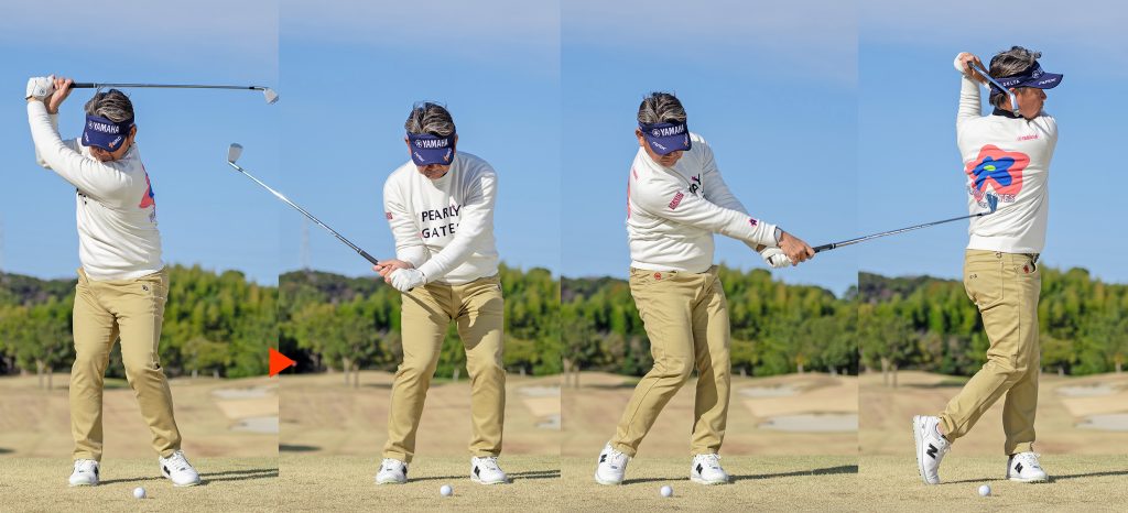 「足踏みするようにテークバックで右足を踏み、左足を踏んで切り返し。これが体で打つスウィング。下半身から作るのがレッスンの定番ですが、それだと振り遅れやスライスになる可能性大です」