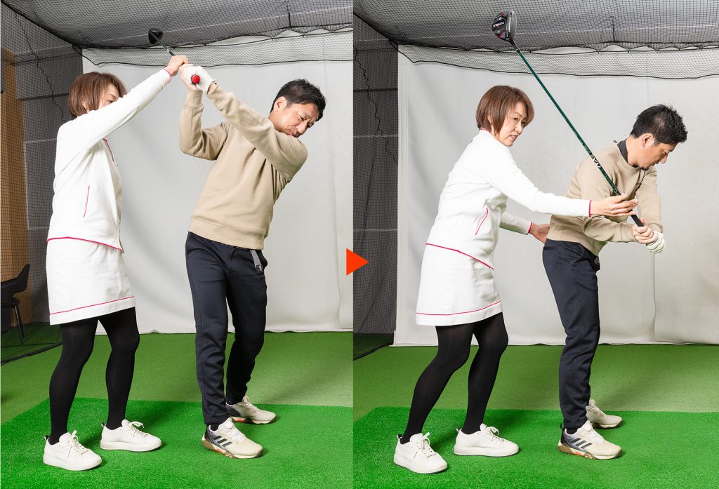 始動が雑だとヘッドは簡単にインに入りやすい。グリップのすぐ上の部分で、両手の間隔を狭めて手元をしっかりさせ、丁寧に始動するといい