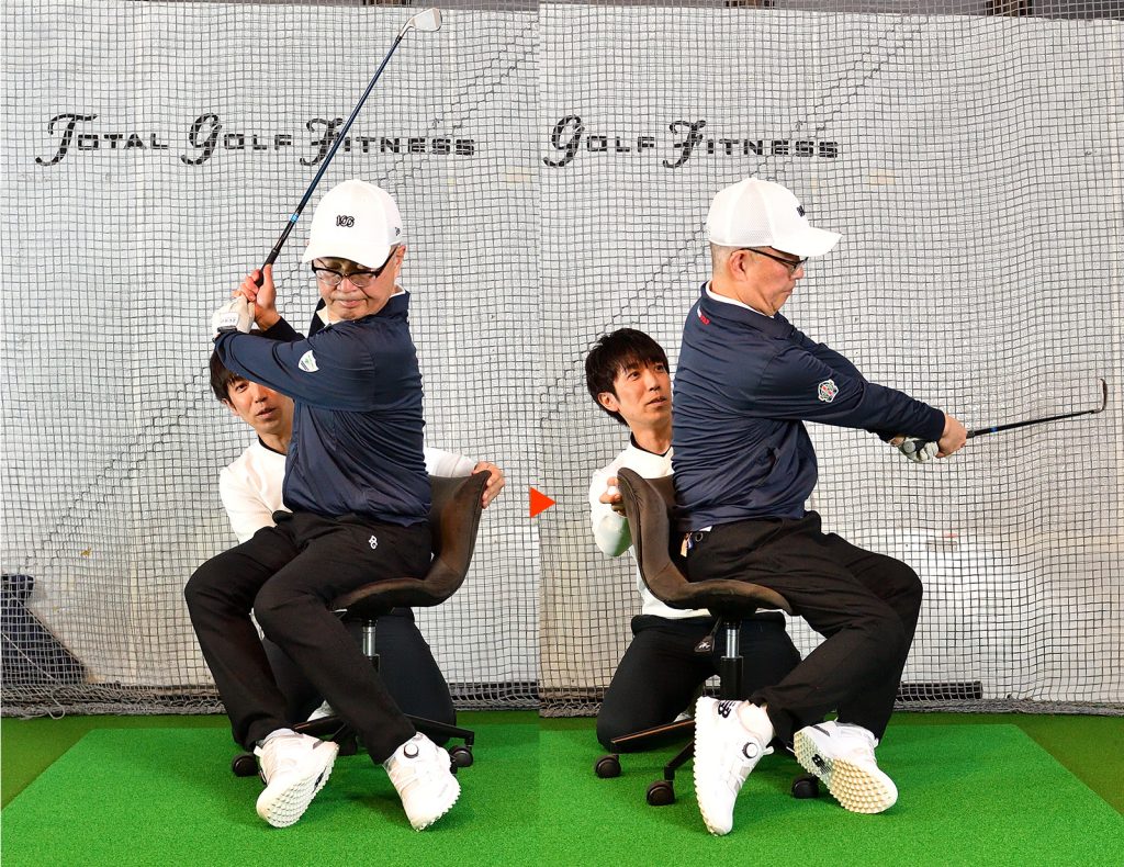 コースでリズムが悪くなるのは、緊張、力み、当てたいという「欲」などで体のどこかにブレーキがかかるから。これは言わば、回転椅子が回らないように踏ん張っている状態。椅子ごと回れば上半身、下半身ともスムーズに動く