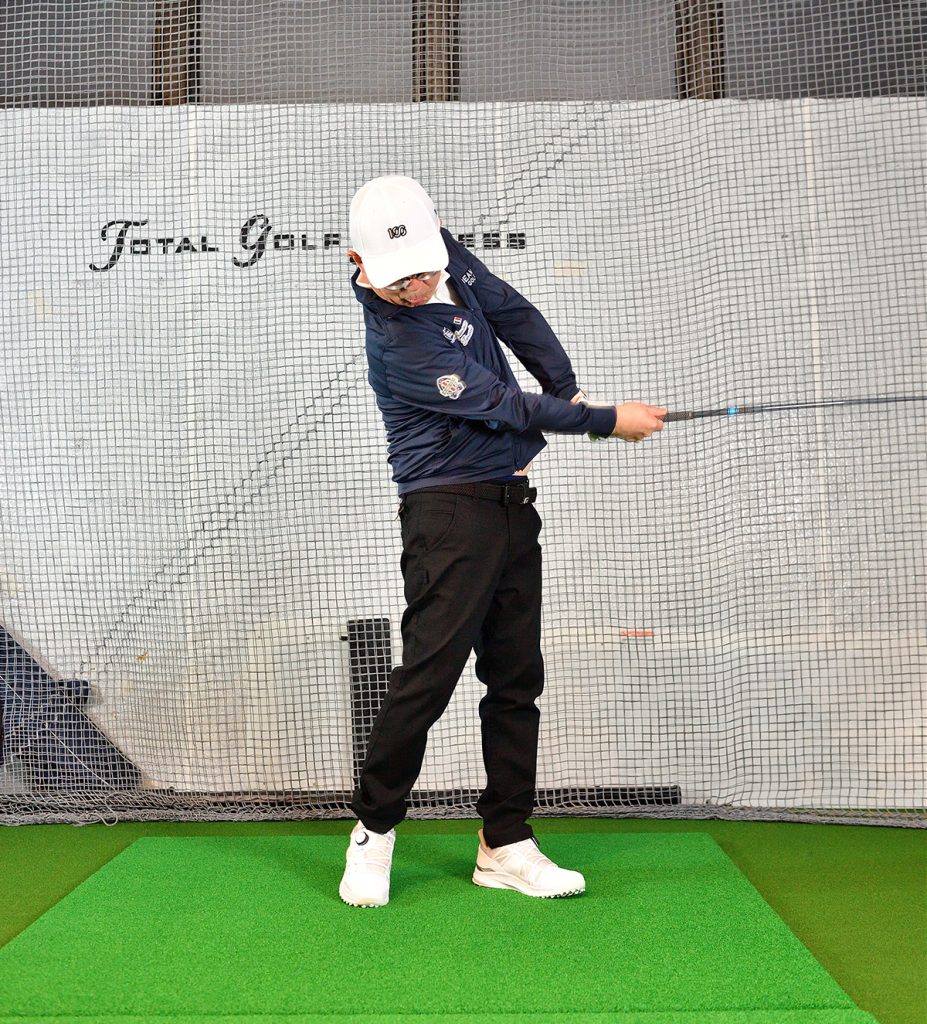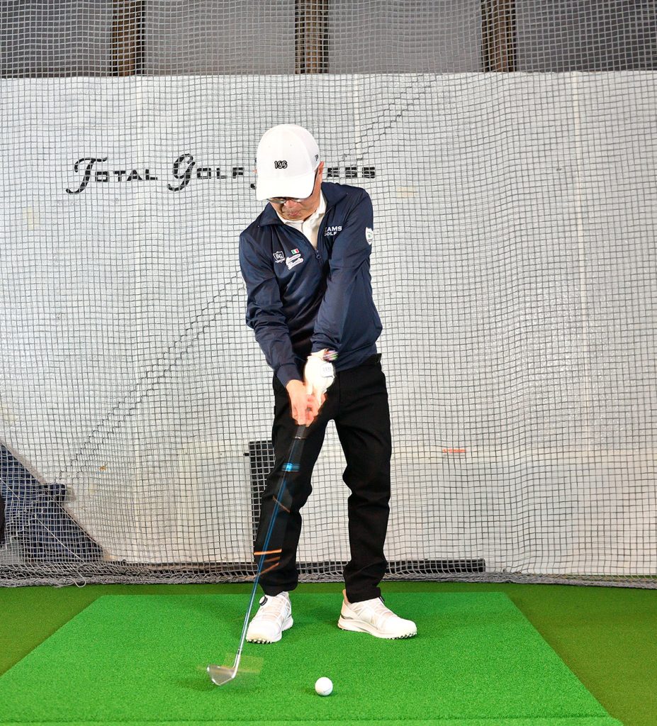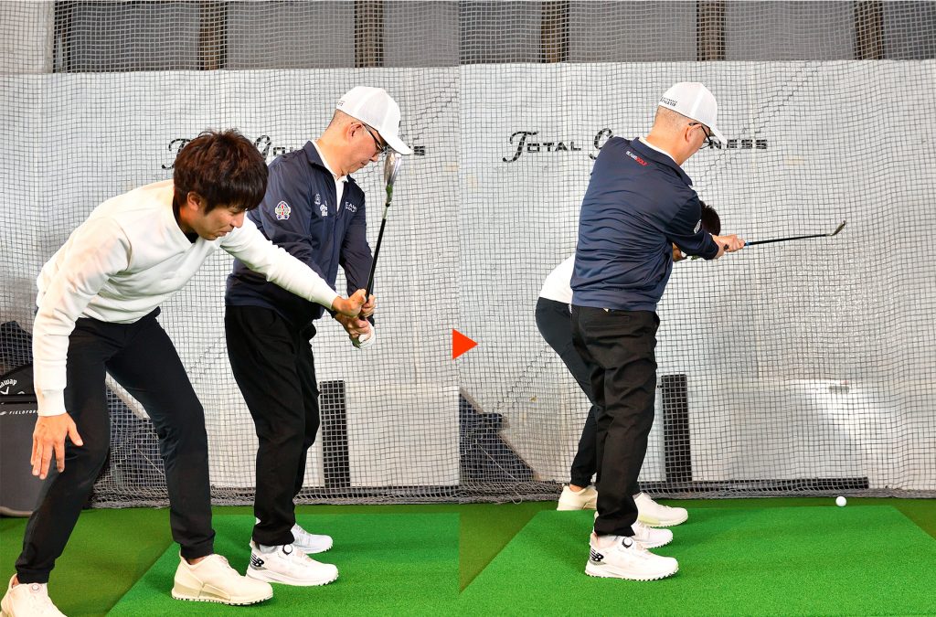 インパクトからフォローにかけて、左右の腕の間隔を狭めながら振り抜く。間隔をキープして振ると、ヘッドが返らず球がつかまらない