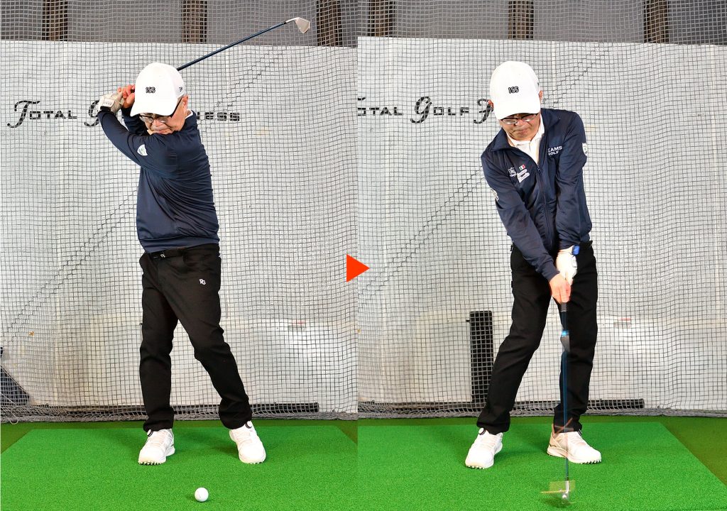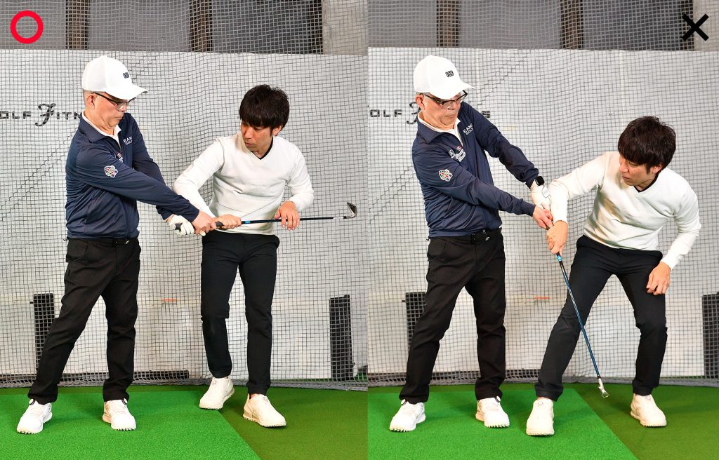 後ろから見たときにトップ、フォローで左ひざが右ひざに隠れてしまうのは、ひざが棒立ちの証拠。これだと上半身もスムーズに動かない