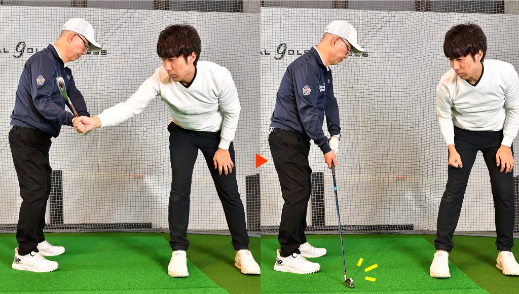 手首は上半身で一番力みやすい場所のひとつ。クラブが水平になったところで支えてもらい、支えを外すとヘッドが落ちるくらい力を抜く
