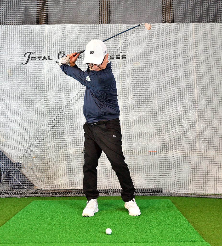 このスウィング自体はあまり大きな問題がない。コースでリズムが悪くなるとしたら、大抵の場合は、緊張、あるいは力みで下半身が棒立ちになることが原因