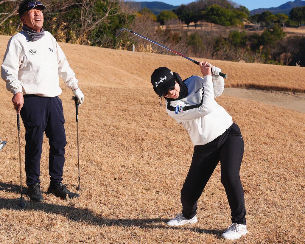 木下 これで30ヤードくらいのアプローチ、いけますね。試合で今度やります。崖下に行っても使えそう。実は、動画を撮って友達に送ったら、「これで打ち方合ってる?」と返信がきました(笑)。