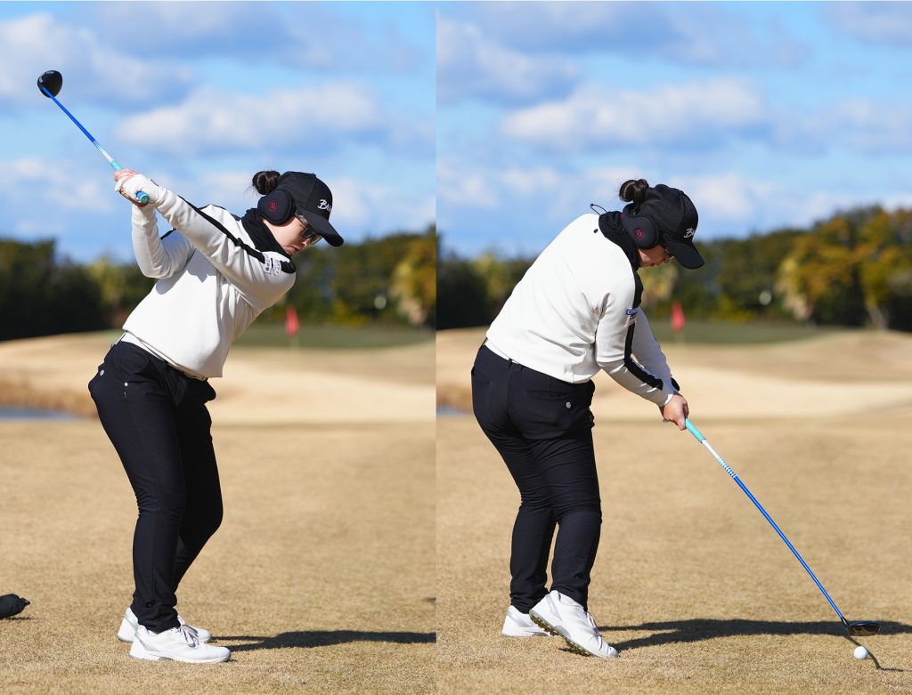 奥田 彼女のショットはめっちゃ振りが「横」で僕たちの「水平打法」と近いけど、すごくスピードも出る。スウィング動画を何回も見ていたら、フォロースルーがネリー・コルダと重なった。インパクト付近でヘッドの先がヒールよりも沢山動いている。これは“ねじ回し”という動きで、フォローで少し右手が伸ばされる感じになっていく。彩プロはこれができているのでスウィングは一切変えなくていい。