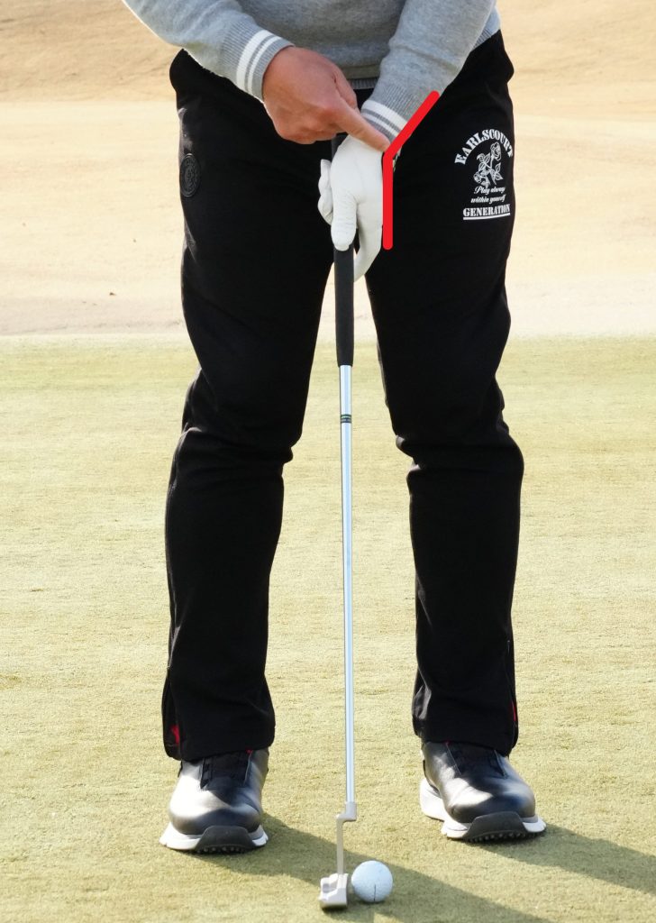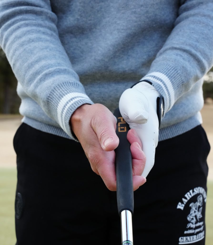 フックラインや下りのパットは、親指でグリップの上面を押さえつける動きが生じてフェースをこねやすい。グリップを下から支えるイメージでストロークすると予防になる